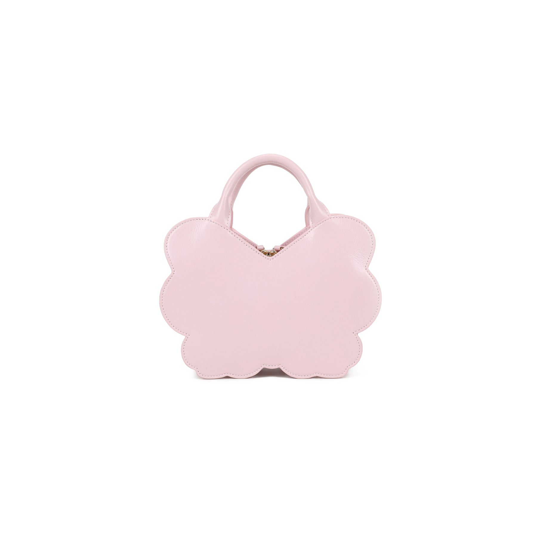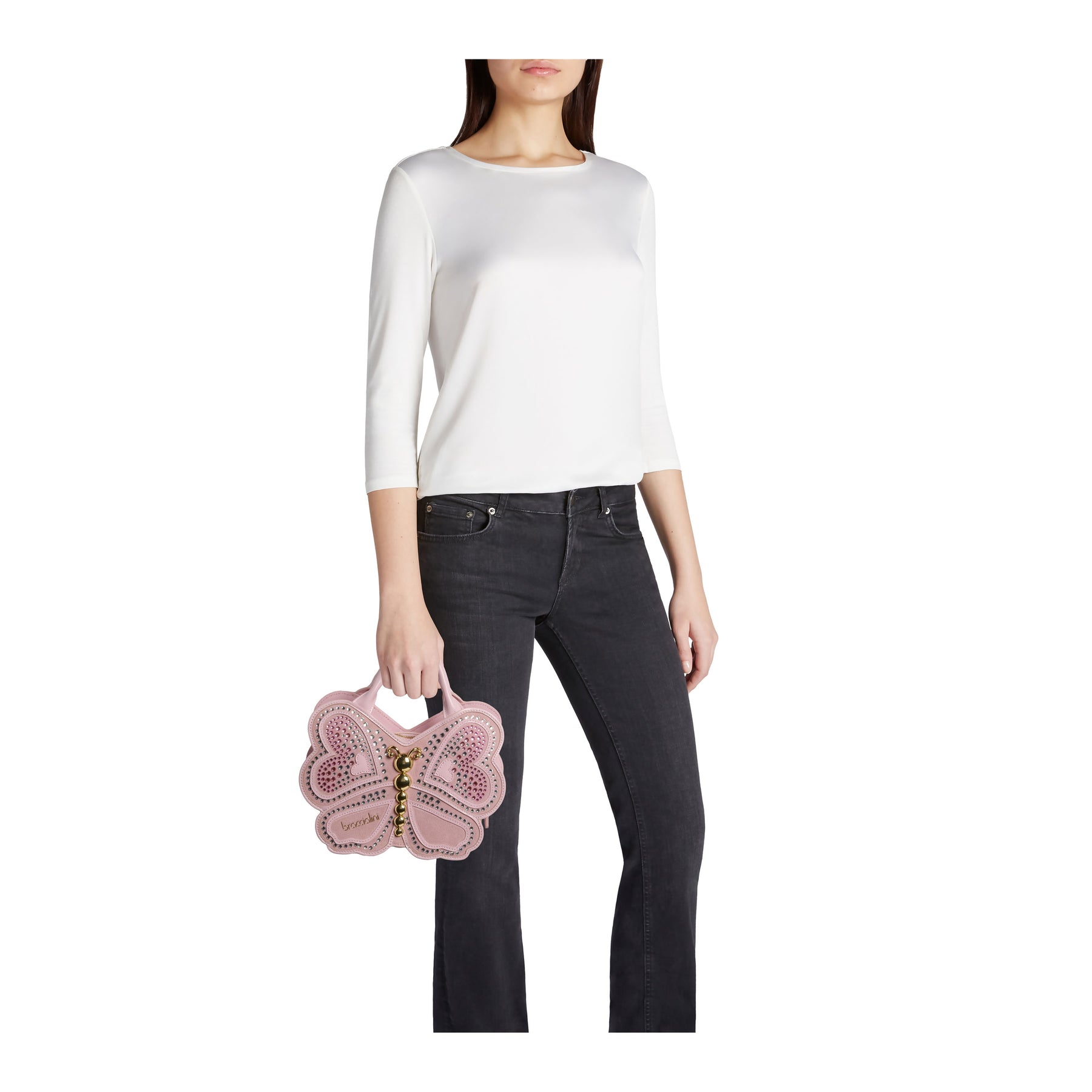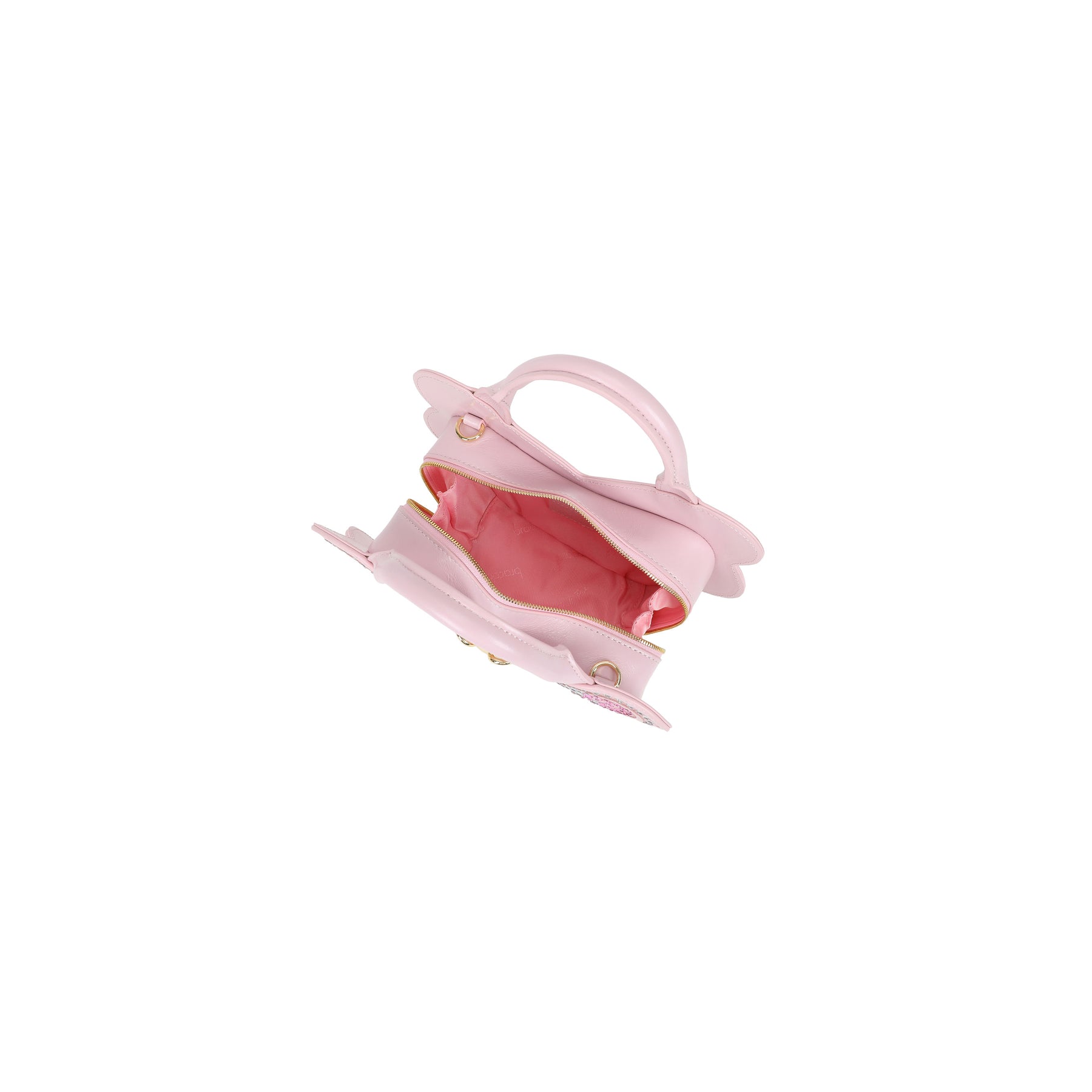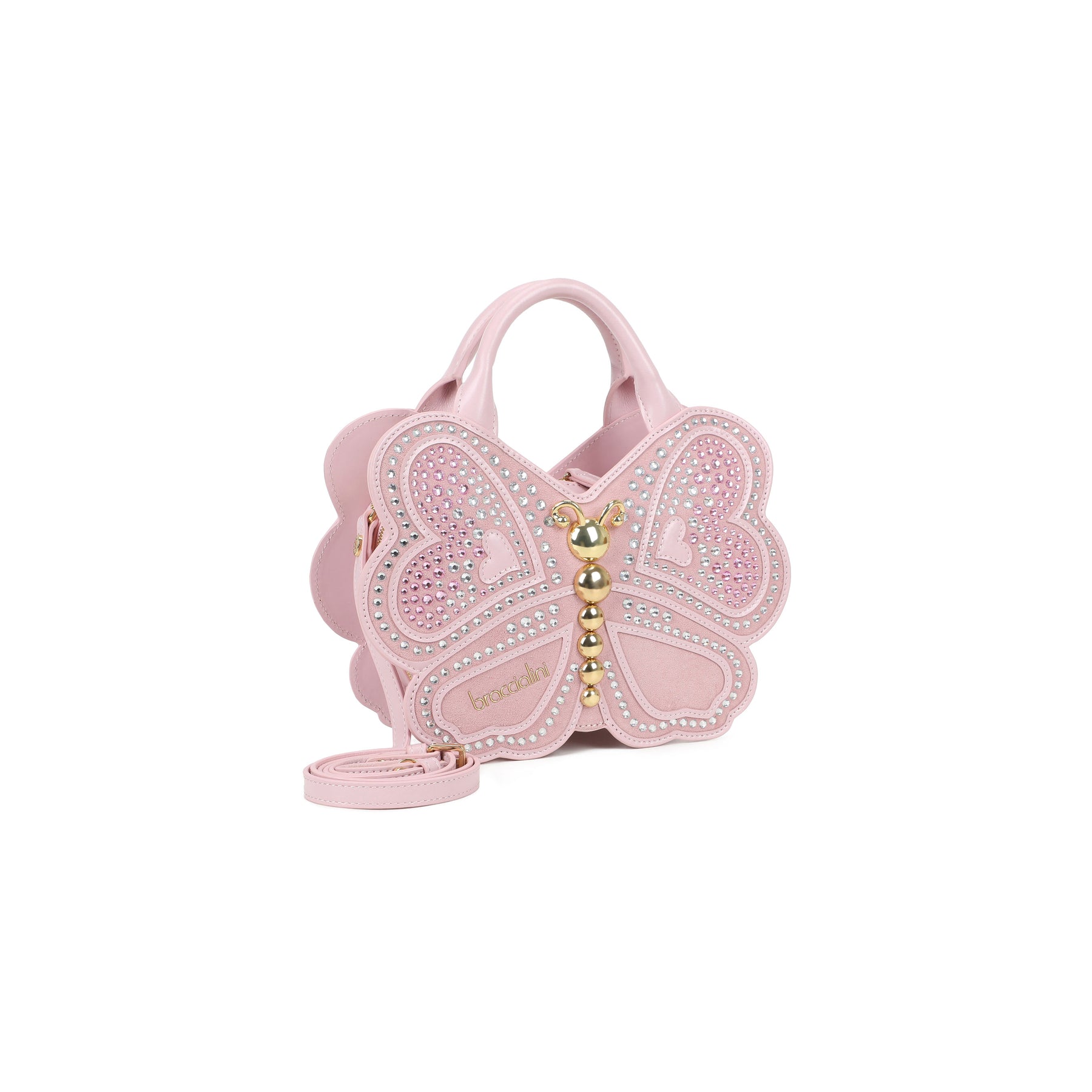 Borsa a mano in pelle a forma di farfalla, con doppi manici e tracolla regolabile e removibile. La silhouette semirigida si accende grazie a una luminosa lavorazione frontale: un corpo centrale dorato abbracciato da ali preziose, dove strass degradé sui toni del rosa si fondono con cuori applicati e profili traforati. Un accessorio poetico e fuori dagli schemi, pensato per chi ama la moda che racconta una storia di leggerezza, fantasia e femminilità.