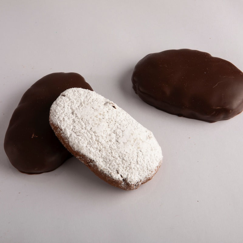 - 4 Pan dei morti: impasto morbido con frutta secca (fichi, uvetta e albicocche), impreziosito con diverse spezie, ricoperto di cioccolato fondente Perù Pachiza 70% o zucchero a velo.