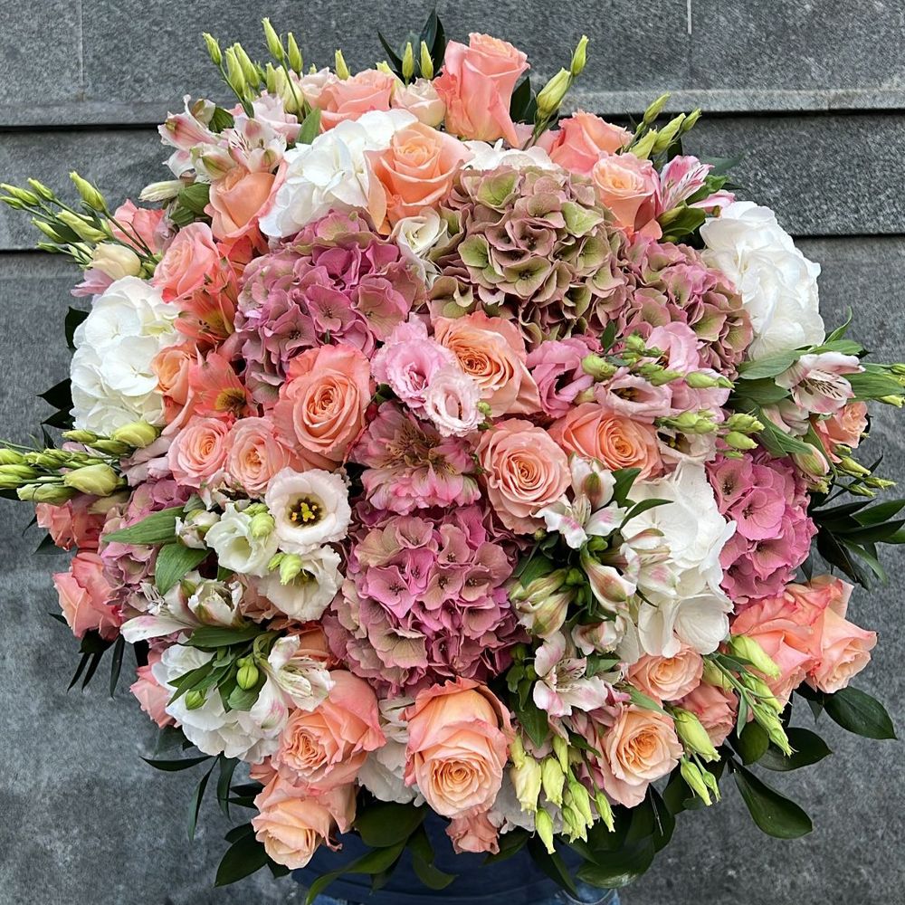 In questa composizione, i toni pesca e avorio delle rose si fondono con la delicatezza del lisianthus, mentre le ortensie, con le loro sfumature che virano dal rosa al verde, evocano le ultime carezze del sole prima che l’autunno si ritiri nel silenzio. Ogni fiore è disposto con cura, come se danzasse in cerchio attorno a un ricordo, creando un equilibrio visivo che parla d'eleganza, calore e nostalgia.