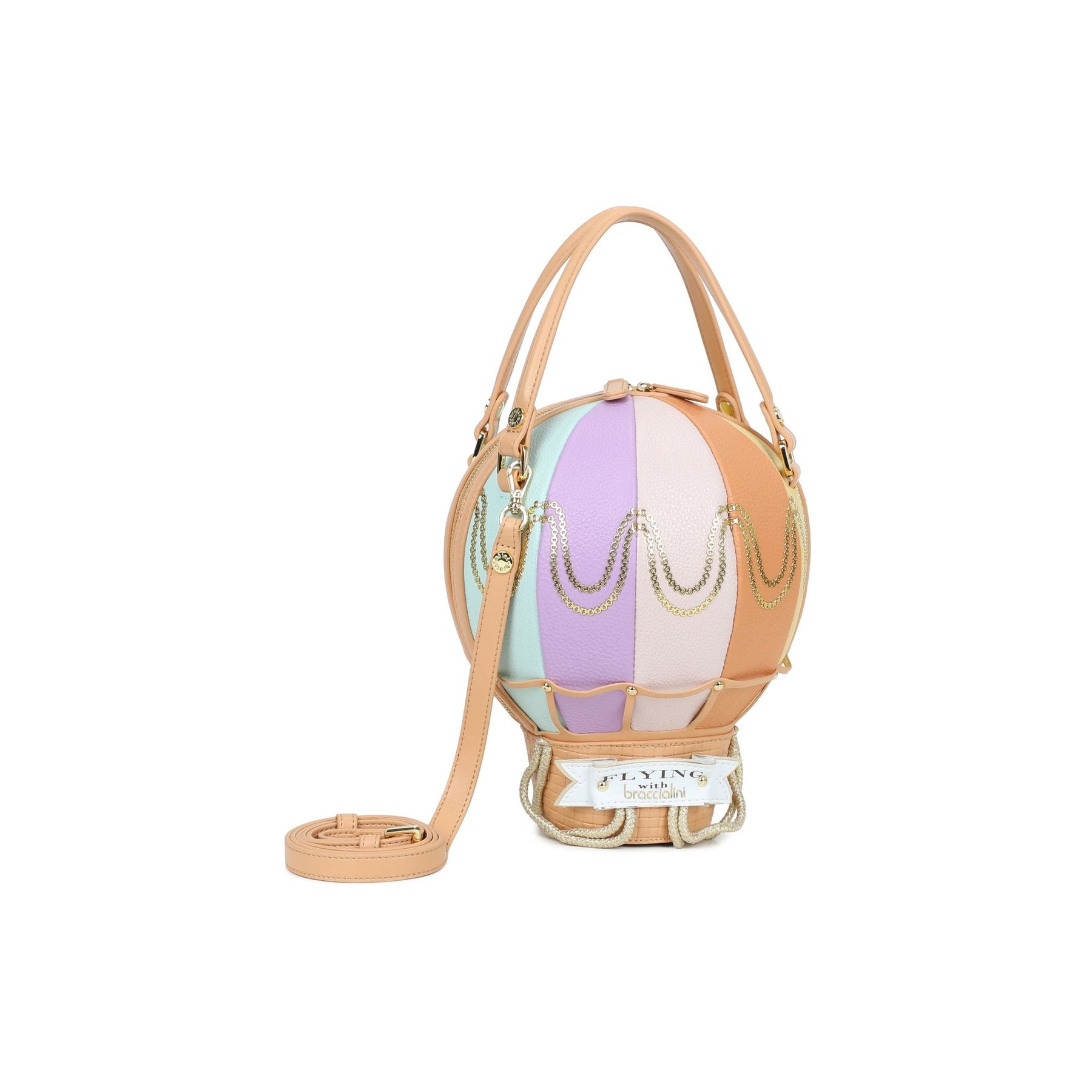 Borsa a mano in pelle a forma di mongolfiera, con doppi manici e tracolla regolabile e removibile. Incanta per i suoi spicchi color pastello, i profili dorati e una raffinata base intrecciata. Una piccola opera d’arte in miniatura pensata per l’anima sognatrice che desidera portare un tocco di magia e leggerezza nella propria quotidianità.