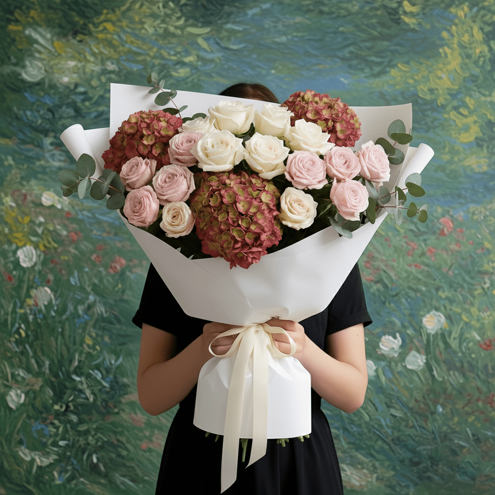 Questo bouquet è un delicato sogno floreale che sembra sbocciato direttamente dal giardino di Claude Monet a Giverny, lo stesso che fa da sfondo incantato all’immagine. I toni pastello delle rose rosa e avorio si fondono con leggerezza, richiamando le pennellate soffuse e luminose del pittore impressionista. Tra i fiori, spiccano i tocchi di verde e bordeaux dell'ortensia autunnale, che aggiungono profondità e una carezza profumata alla composizione.