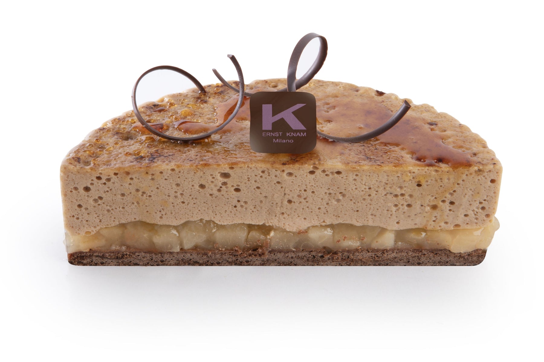 Base frolla al cioccolato, composta di pere, massa di cacao fondente 100% e crema pasticcera al cioccolato fondente.