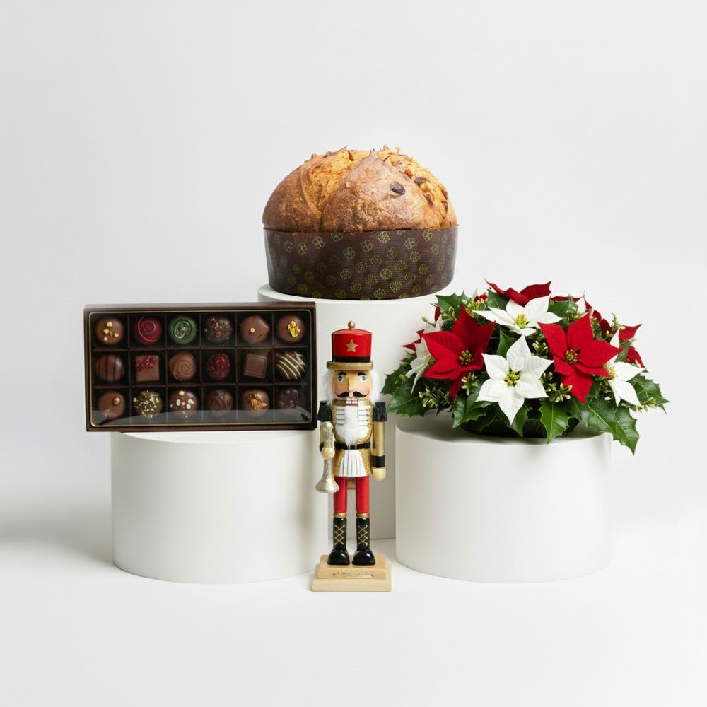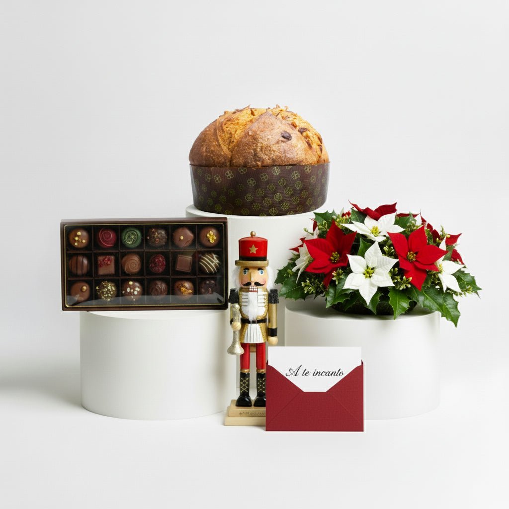 • Originali Deluxy: panettone artigianale, praline, centrotavola natalizio e schiaccianoci in legno