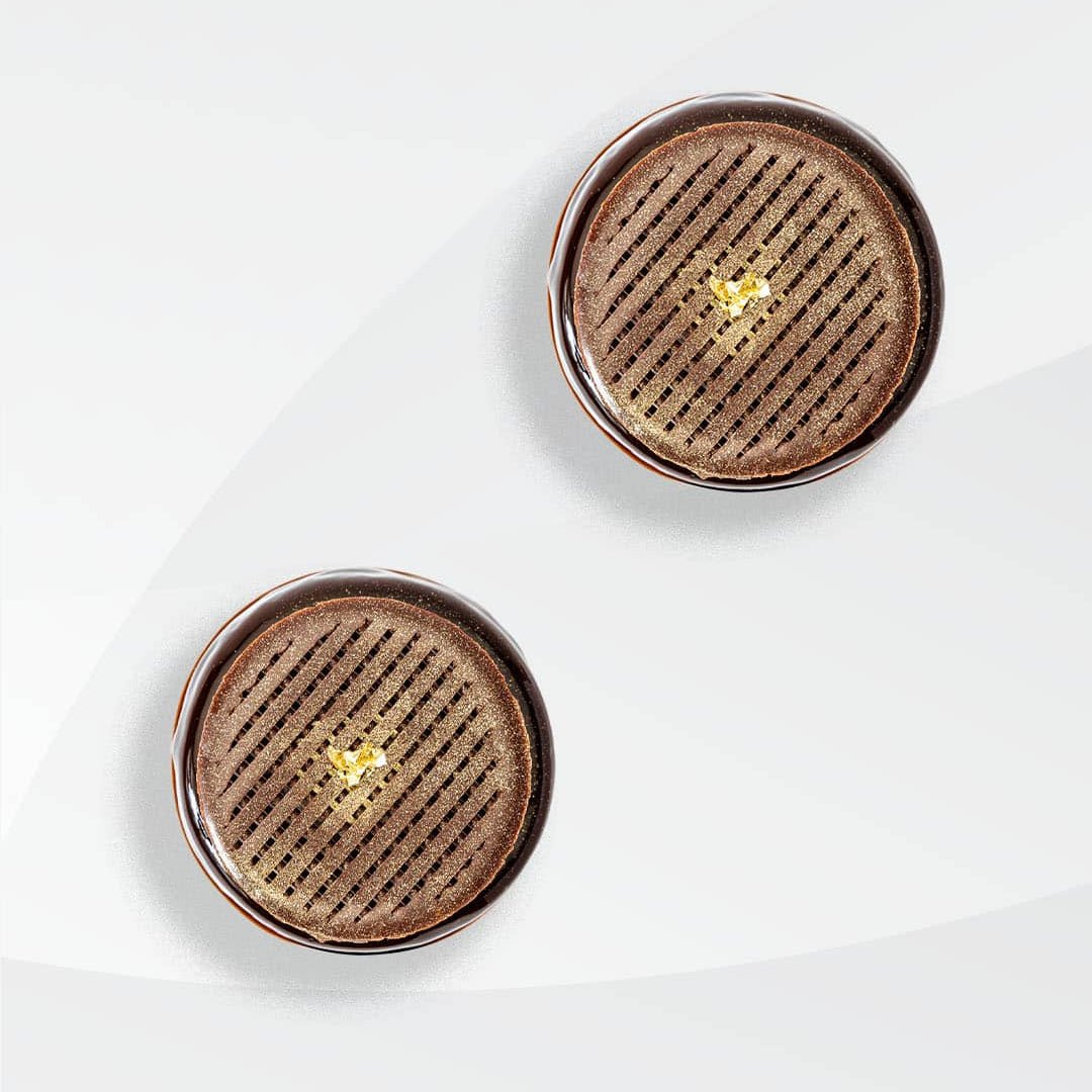 Торт на одну порцию, состоящий из бисквита с низким содержанием какао и миндальной пудры, пралине, маскарпоне и крема из эспрессо с каве, мандаринового желе Ciaculli и мусса из 68% темного шоколада из Ганы.